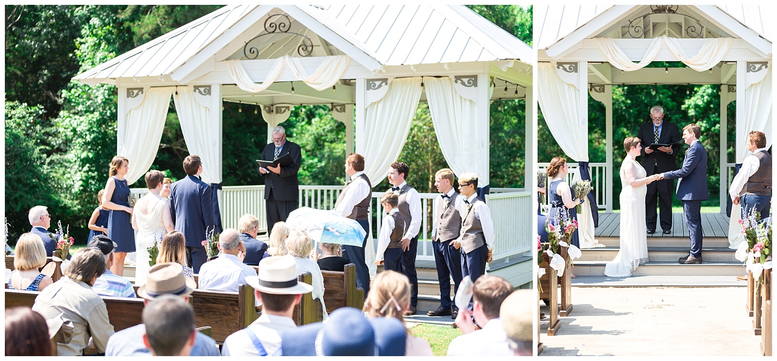 Despite the heat, blinding sun, and a few mosquitoes (which are all staples of summer days living in the South!), Shelby and Alex’s guests arrived with hats, umbrellas, and fans in tow, ready to watch the two of them take their vows in front of a small gathering of family and friends. Their choice of music and verbiage during the ceremony had Josh and me “geeking” out the whole time, as we heard John Williams coming from the loudspeaker and Lord of the Rings references in the vows. Shelby and Alex’s ceremony was sweet and it only became more evident throughout the day that these two are absolutely meant to be together!